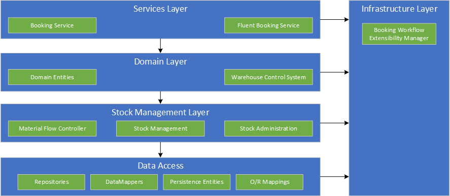 On top of all the layers, the Services Layer serves as the public API of the Warehouse Management System. All the booking functionality, that is provided by WMS can be accessed here. Therefore, a standard Booking Service is available as well as a Fluent Booking Service API. An example for each type of service results from [Macro Architecture].